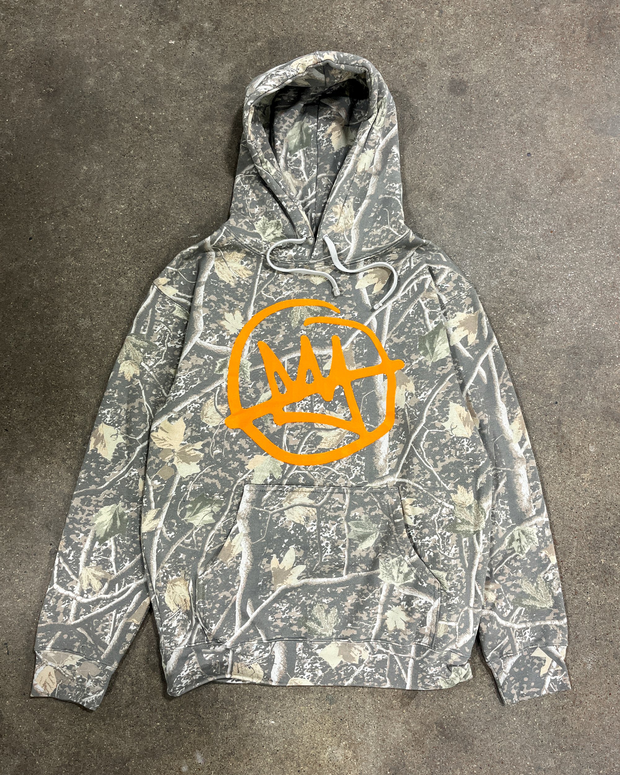 Limited edition drop for the season. Hunter orange print on Independent Deadwood Tree Camo pullover hoodie (IND4000 variety).